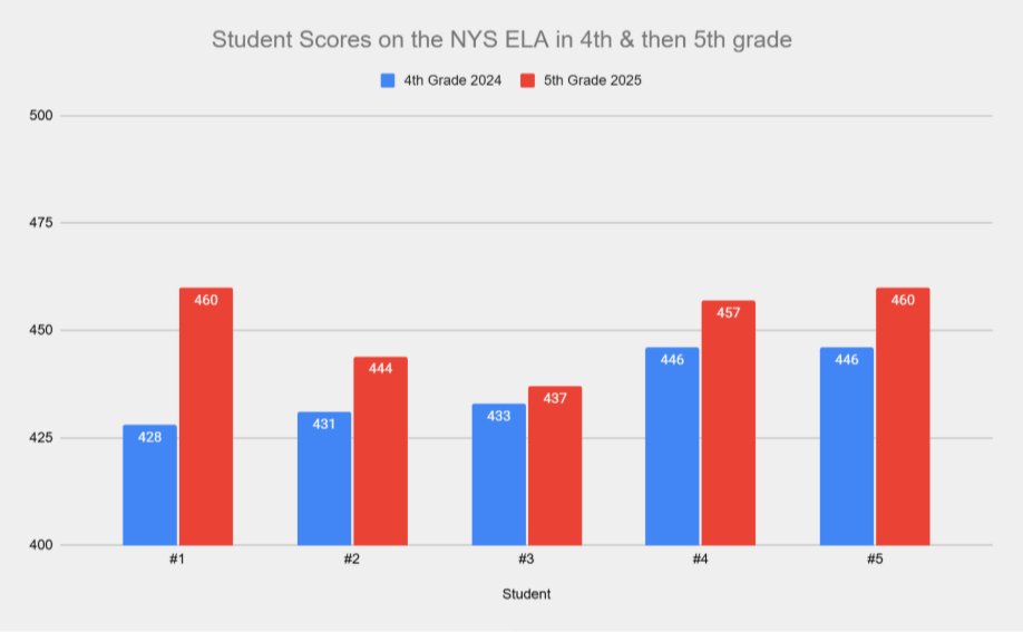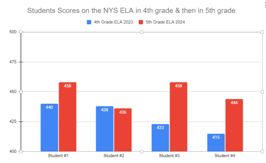 These are state ELA test results from 2023 & 2024. The blue bar represents how these students performed on the 4th grade state ELA assessment. The red bar indicates how the same students performed on the 5th grade state ELA assessment. I attribute much of their growth to the Word Mapping Project curriculum used in 5th grade. Two students reached the proficiency level cut score of 450. One other student made significant growth and came close to the reading proficiency cut score.