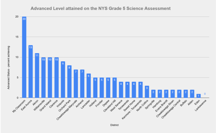 These are the Science state test results from Erie County in New York State for 2025 for students reaching the advanced level. The state 5th grade science test is quite dense with a lot of academic vocabulary. My classroom significantly outperformed every other district in the county. I attribute much of this success to the Word Mapping Project curriculum that I use on a daily basis.