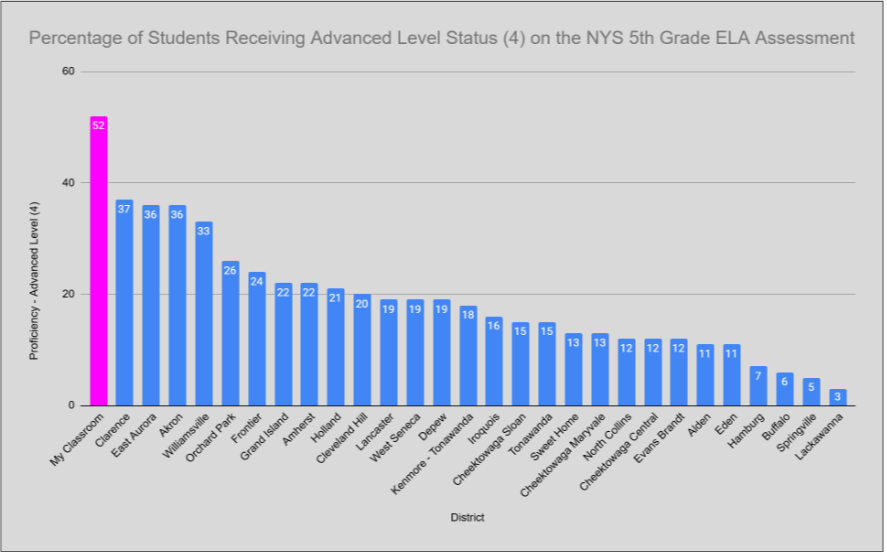 These are the ELA state test results from Erie County in New York State for 2025 for student reaching the advanced level. My classroom significantly outperformed every other district in the county. I attribute much of this success to the Word Mapping Project curriculum that I use on a daily basis.