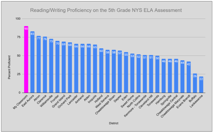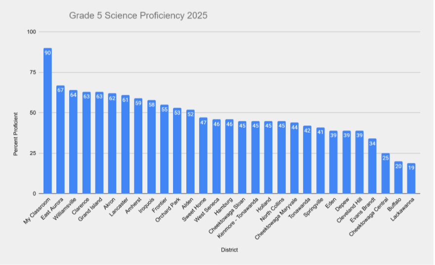 These are the Science state test results from Erie County in New York State for 2025. The state 5th grade science test is quite dense with a lot of academic vocabulary. My classroom significantly outperformed every other district in the county, rivaling the best schools in the entire state of NY. I attribute much of this success to the Word Mapping Project curriculum that I use on a daily basis.